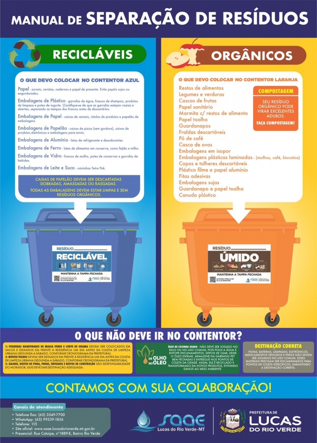 Pequenas quantidades de massa verde e corte de grama devem ser colocadas em sacos e deixadas em frente à residência um dia antes da coleta de limpeza urbana (segunda a sábado, conforme cronograma da Prefeitura).