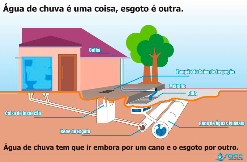 A interligação da tubulação da água da chuva na rede de esgoto gera sobrecargas nas redes e pode causar o retorno do esgoto para dentro dos imóveis, o que provoca um considerável risco a saúde de toda família, além da possibilidade de prejuízos materiais.
