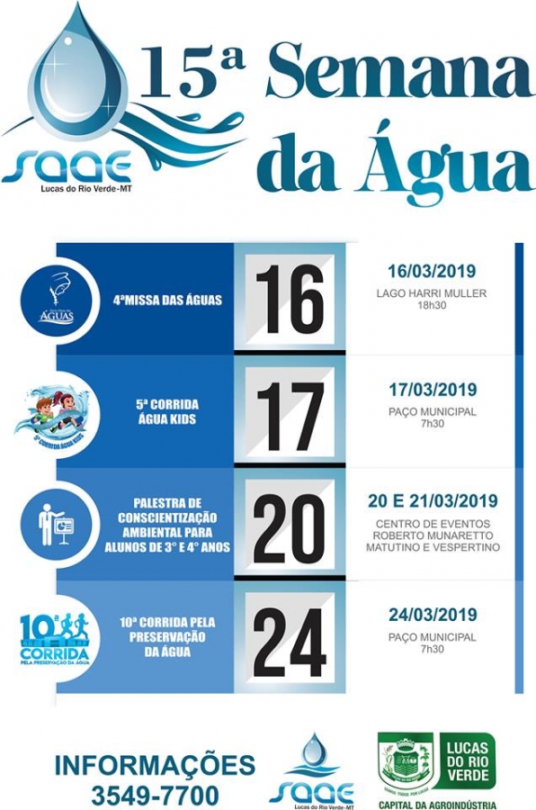“Será uma semana com uma programação intensa, com várias ações que vão desde as crianças até os adultos, com missa, corrida kids, palestras de preservação da água, separação do lixo, além da Corrida da Água, que já é tradição e envolve muitas pessoas e participantes. Para nós é gratificante promover mais uma edição” disse o diretor do Saae, Raimundo Dantas.