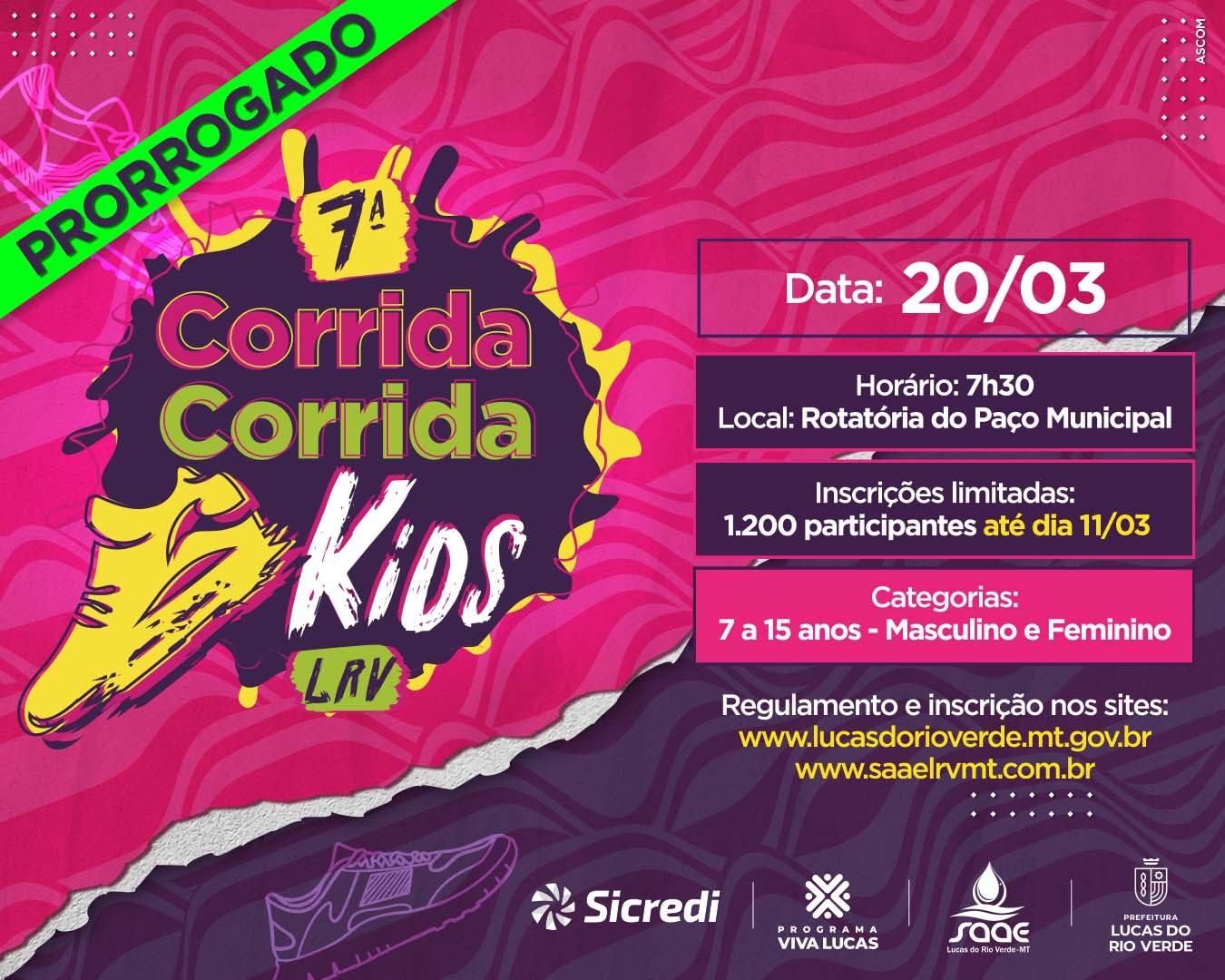 As inscrições para a 7ª edição da Corrida Kids de Lucas do Rio Verde foram prorrogadas. O prazo para os interessados terminaria hoje (04), mas foi prolongado até a próxima sexta-feira, dia 11 de março.